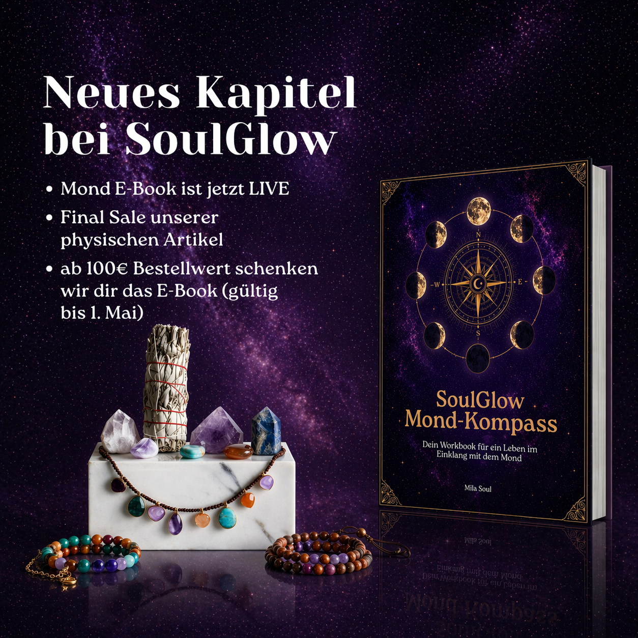 Ab 100€ Bestellwert im Shop bekommst du das Mond E-Book automatisch GESCHENKT. Es kommt innerhalb von 24 Stunden per E-Mail zu dir. Diese Aktion gilt nur bis zum 01.05.26 (kommender Vollmond) als Jubiläumsgeschenk.