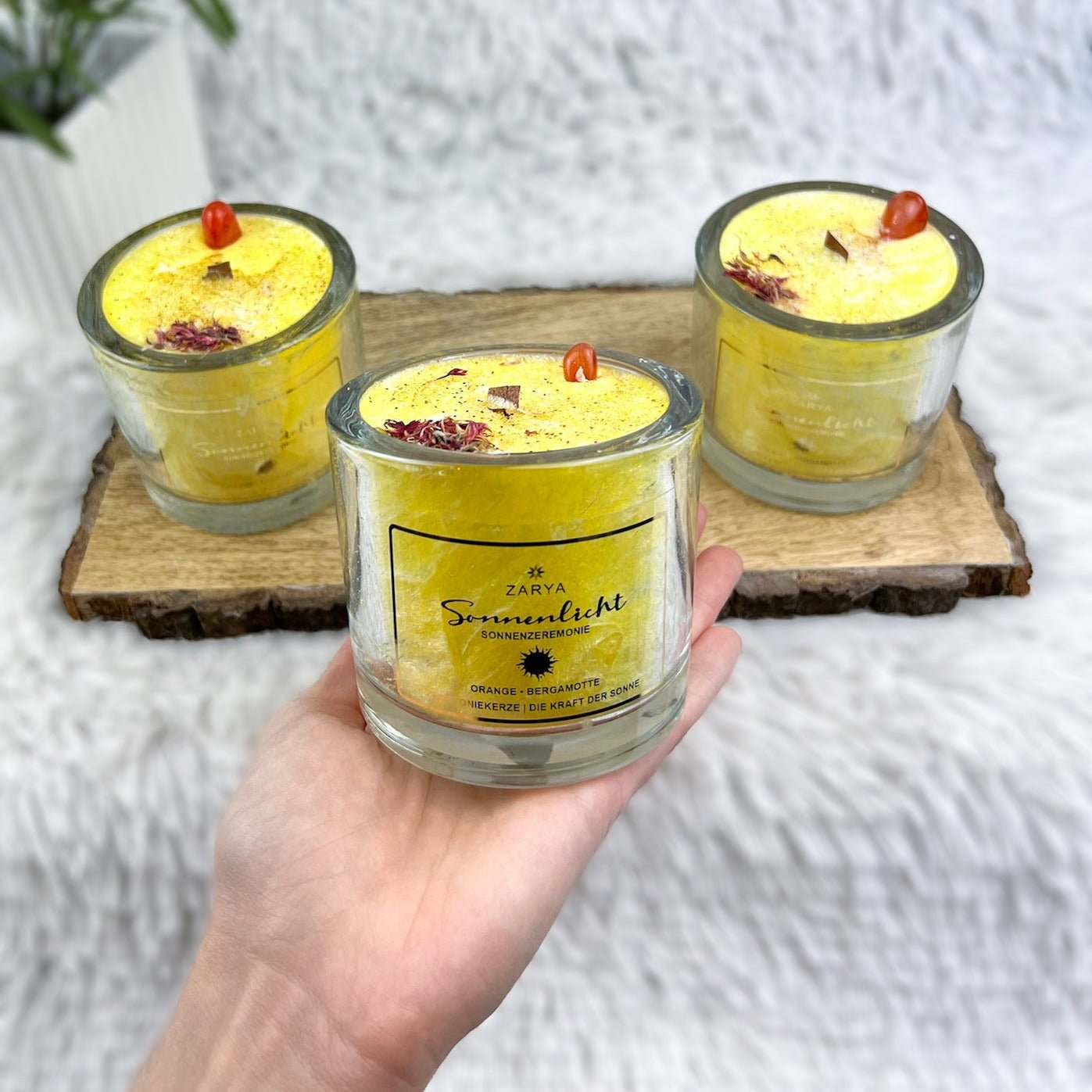 Diese handgefertigte Zeremoniekerze Sonnenlicht begleitet dich in Momenten, in denen du neue Energie, Optimismus und Lebensfreude in dein Leben einladen möchtest. Ihr warmer Duft nach Orange & Bergamotte erinnert an das Strahlen der Sonne und schenkt dir das Gefühl von Zuversicht, Leichtigkeit und innerer Stärke.
