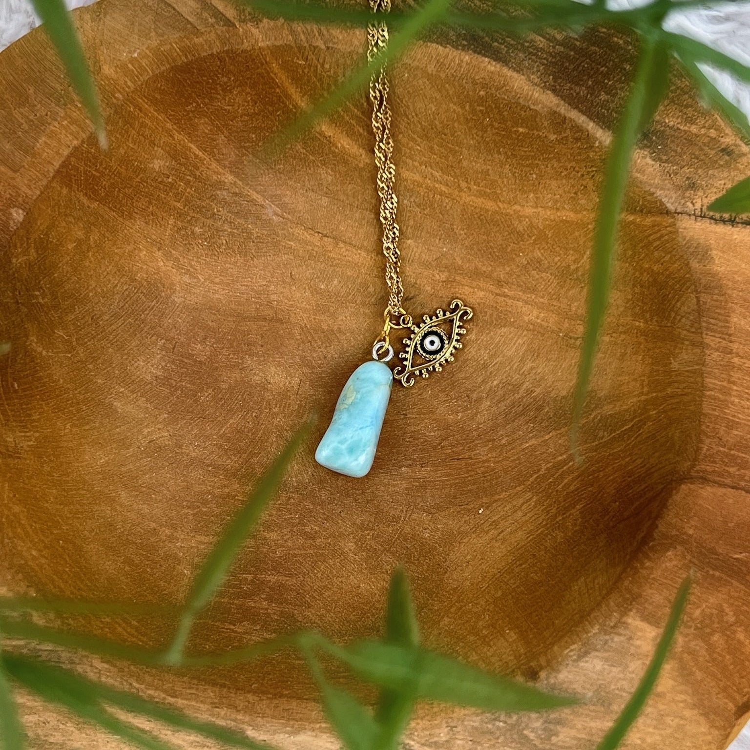 Der Stein wird mit einer vergoldeten Edelstahlkette geliefert. Die Kette besitzt ein besonderes goldenes Auge als Detail und macht dieses Schmuckstück zu einer außergewöhnlichen Unikat-Kette.