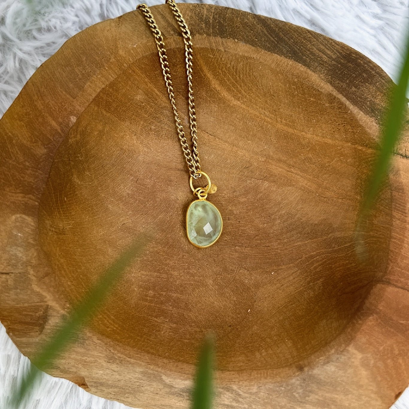 Diese Prehnit Unikat Kette vereint einen facettierten Prehnit mit einer hochwertigen Fassung aus 925er Silber vergoldet. Durch den präzisen Schliff entstehen feine Lichtreflexe, die den zarten Grünton des Steins besonders schön zur Geltung bringen.